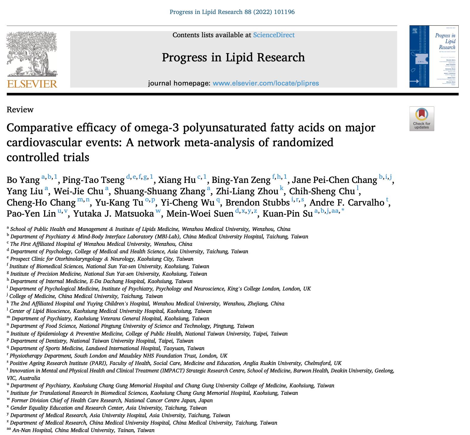 针对这个重大健康议题,公司公共卫生与管理学院杨波校聘研究员团队,联合台湾中国医药大学身心介面研究中心研究团队和多名国际脂质研究学者,在国际脂质医学顶级期刊《PROG LIPID RES》(5-year IF=17.40)发表题为“Comparative efficacy of omega-3 polyunsaturated fatty acids on major cardiovascular events: A network meta-analysis of randomized controlled trials”学术论文,校公共卫生与管理学院为第一作者和通讯作者第一单位:公共卫生与管理学院杨波研究员为第一作者,亚洲大学神经科诊所曾秉涛医师和附属第一医院内分泌科胡珦副主任医师为共同第一作者,国际知名营养医学专家、台湾中国医药大学身心介面研究中心主任、qy球友会体育脂类医学研究所外方所长苏冠宾教授为独立通讯作者。