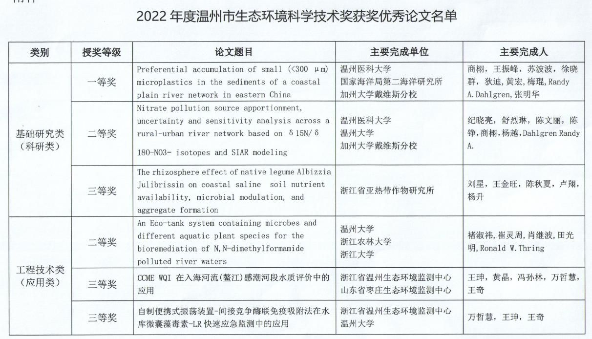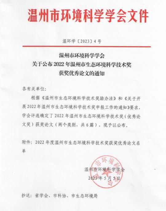 近日,2022年温州市生态环境科学技术奖(优秀论文奖)获奖名单公布。公司作为第一单位喜获2项温州市生态环境科学技术奖,其中一等奖1项,二等奖1项。