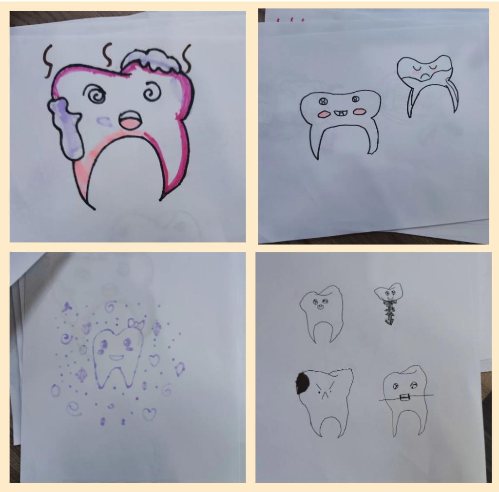 最后,志愿者们发放白纸和水彩等绘图工具,让小朋友们画下自己认知中的健康牙齿和不健康牙齿,并对其进行辨认。