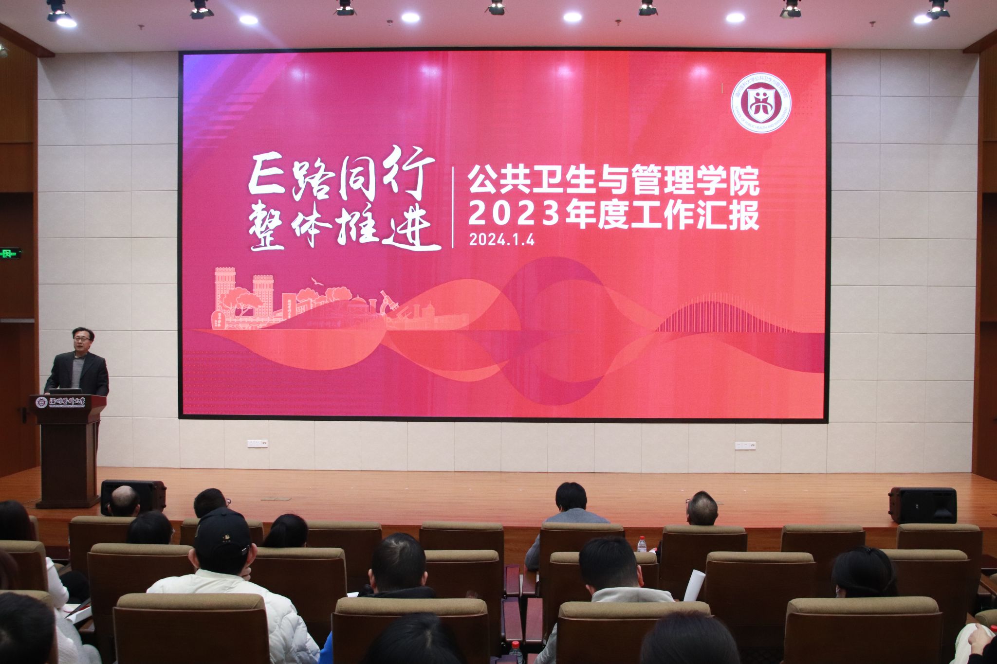 为全面总结2023年度各项工作,推动2024年度工作开好局、起好步,2024年1月5日,公共卫生与管理学院于生物医药科研楼学术报告厅召开全体教职工大会,全体领导班子及教职工参会,会议由学院党委书记马洪君主持。