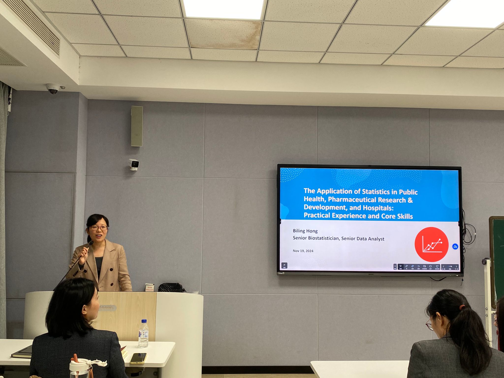 为进一步激发师生们的学术热情和创新精神,让统计学的力量在公共卫生领域得到更深入的挖掘和展现,11月19日下午,qy球友会官网在茶山校区举办了一场学术讲座——“统计学在公卫、医药研发及医院中的应用: 实践经验与核心技能”。讲座有幸邀请到曾在哈佛qy球友会官网工作10余年的高级数据分析师洪碧玲作为主讲嘉宾。活动由公司党委书记王芳主持,教师代表以及研究生、本科生代表四十余人参加。